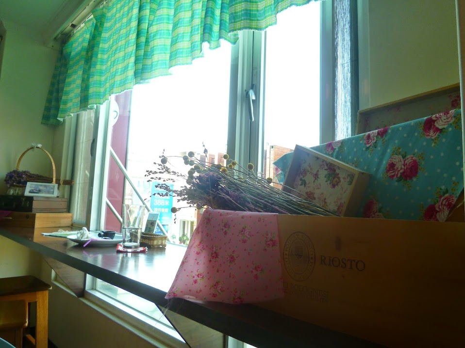 我坐的是靠窗的另一邊,不同於另一邊的白牆,這裡是漆成蒂芬妮藍的顏色