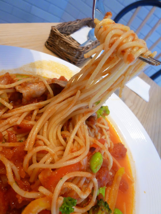 不小心吃完肉片後,只能繼續默默的吃著義大利麵