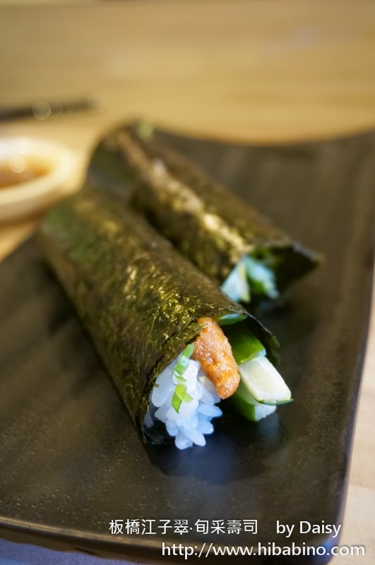 旬采壽司的手捲為細捲狀,醋飯粒粒分明,味道夠,搭配加拿大海膽,多了一點點的腥味,幸好海台裡還包有小黃瓜巧妙地降低了這腥味。