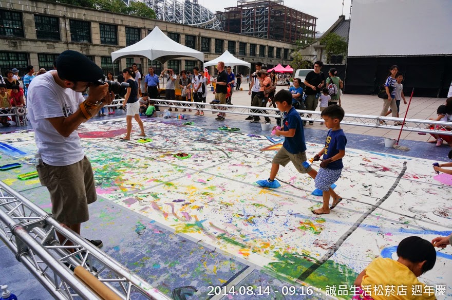 塗鴉活動共分有兩大區域,第一區是當身體變畫筆,可以看到這一區的地板上鋪了一張超大張的白色畫布,畫布上也透過現場的人發揮力量,不論是大人或是小孩,共同參與了這張畫布的彩,讓這一張純白的畫布搖身一變為多彩多姿的colorful畫布。