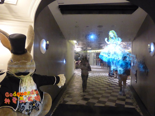 在一片噴霧之中打上投影燈光,迷幻般的艾莉絲、兔子與茶壺依序浮現,好像魔術一般!