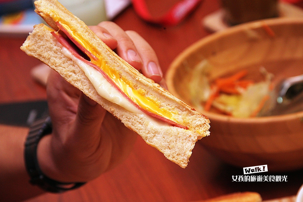 樂樂將家的熱煎三明治,建議可加上他們所附的酸黃瓜一起夾著吃,