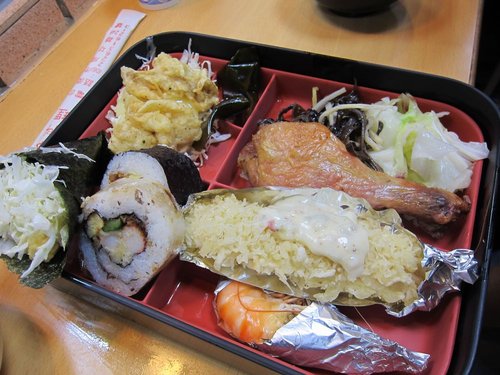 很豐富..但我只愛烤雞腿跟小菜和花壽司...炸魚天富羅和日式炸魚.是冷的..手卷已經做好起來放..都是等著員工擺盤端出去..我還是比較愛新鮮現做啦~~(但是人家是便當..就不能要求這麼多.算超值了)