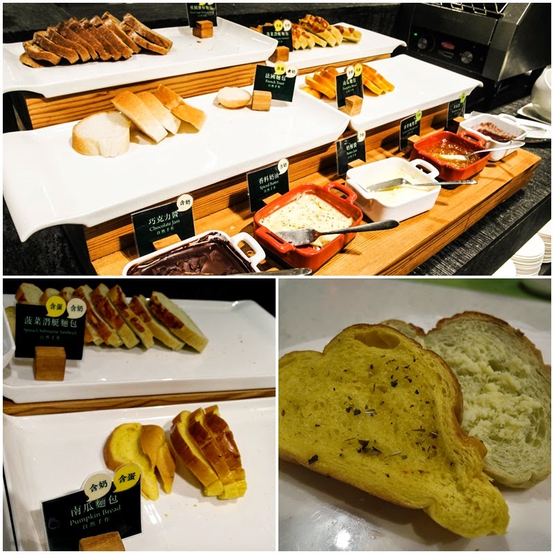 這些麵包都是自家生產的新鮮手做麵包唷,像是南瓜麵包、桂圓雜糧麵包、蔬菜潛艇麵包、法國麵包,也提供多種醬料選擇