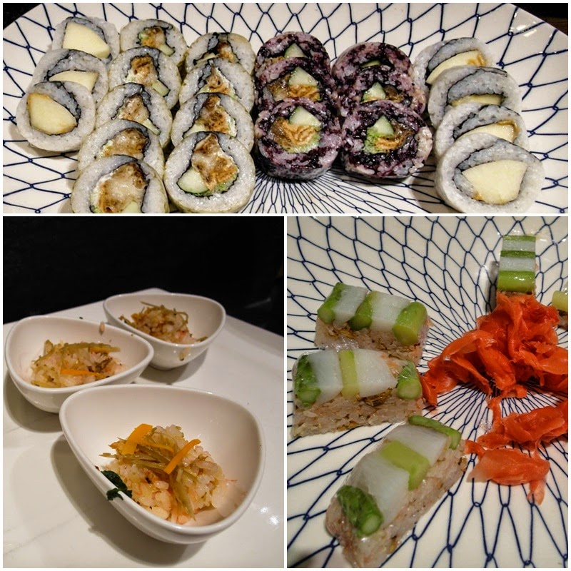 虎皮壽司、蘋果壽司、五穀壽司、五目散壽司、蘆筍押壽司都是全素的餐點