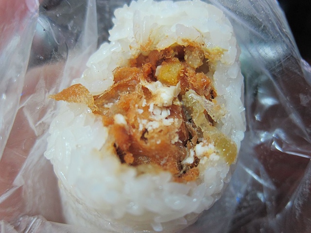 我最愛不軟爛有Q勁的糯米飯..配上香酥脆沒有油漬味的油條..肉鬆..不死鹹的酸菜帶甜味有些微辣(所以又叫酸辣飯糰)..