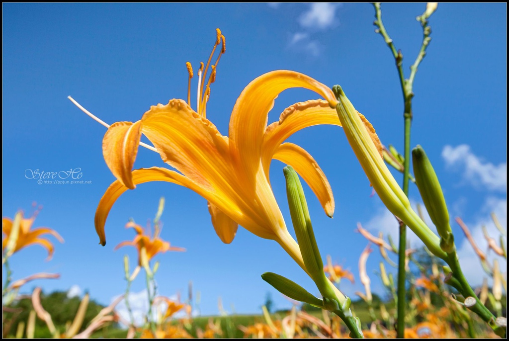 ▼ 老天賞了我們一個賞花的無敵好天氣,藍天白雲,搭配上一大片黃澄的金針花,幸福極了!