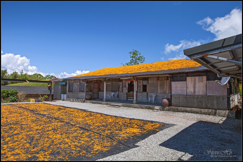 ▼ 來到汪家古厝就是要看這樣的畫面,除了屋前的小廣場,連屋頂上也曬滿了金針。