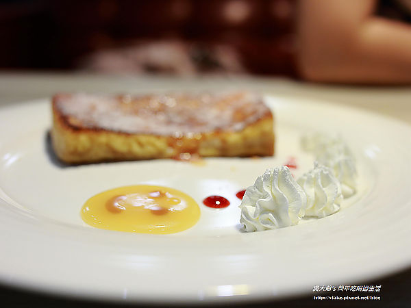 沾附滿滿白醬的法式吐司,一口吃進嘴裡,濃濃的法式吐司煎奶油的香味