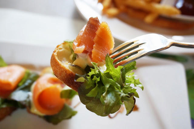以充滿以煙燻鮭魚較鹹重而燻香的風味配上特式的醬料與生菜和以硬脆為口感的法式麵包。
