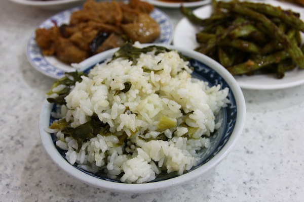 上海菜中不可或缺的主食菜飯,不同於常見的青江菜菜飯,開開看使用的是芥菜,並且是傳統作法,所以菜的顏色不復翠綠,口感也偏軟。然而,也因如此,菜香更能融入飯中,讓菜飯更添香氣。菜飯口感較糊,略有油膩,但卻有著淡淡香氣,讓人胃口大開。