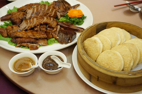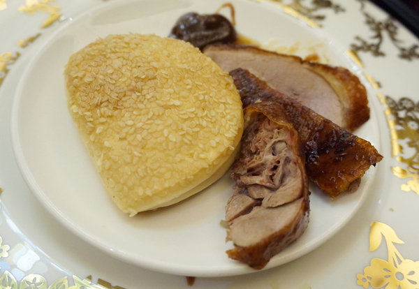就在這時候,服務人員把謙盤好的燒鵝和搭配的餅皮一起端上桌