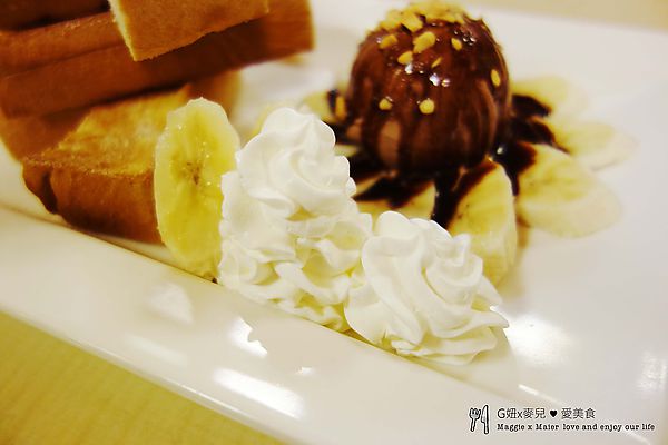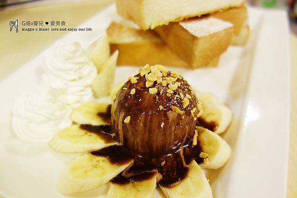 旁邊附上鮮奶油和香蕉及巧克力冰淇淋