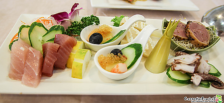 第一發。首先送上的是冷盤五拼,有生魚片、冷筍、鴨肉切片(櫻桃鴨)、章魚及自製飛魚卵。