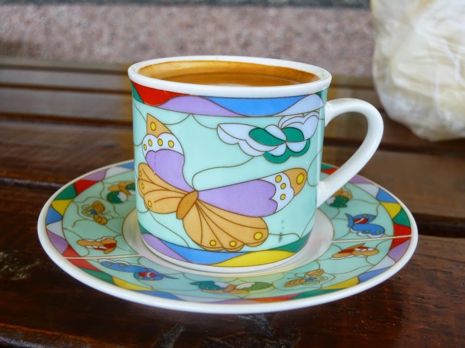 老媽是義式濃縮黑咖啡,用的杯盤還挺美的(因為很花XD)