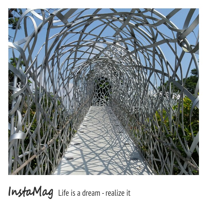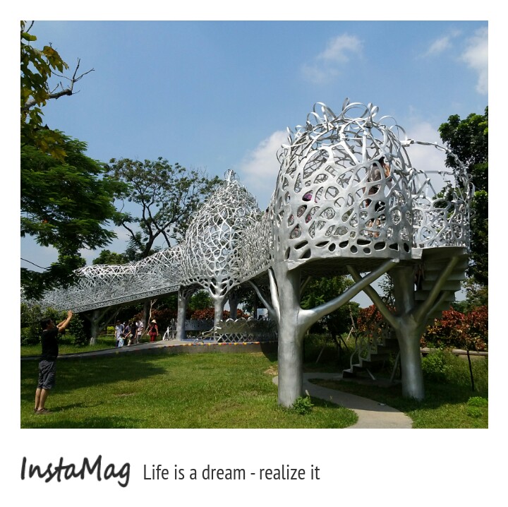月影潭心風格有點類似嘉義的森林之歌,都是出自藝術家王文志的作品,有藤蔓圍繞的感覺,不同的是月影潭心是以銀色鋁片交織出鏤空花紋,底部再以樹幹為支撐,做出像大型鳥巢的藝術裝置
