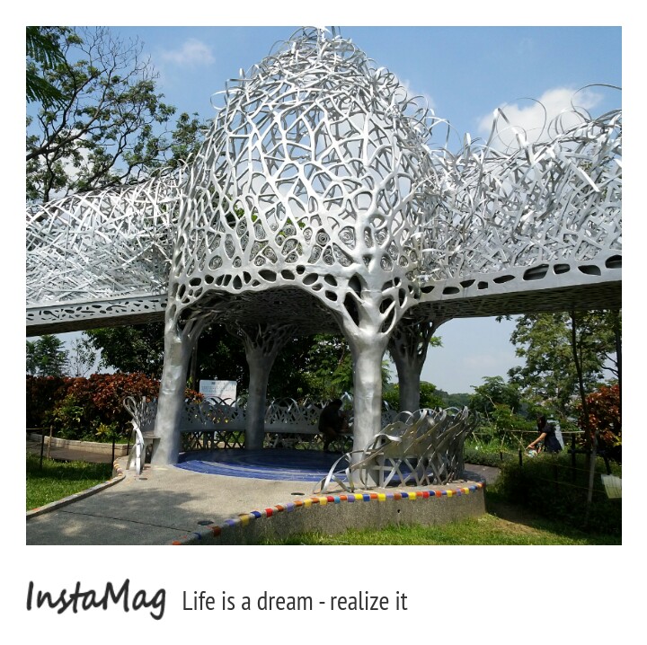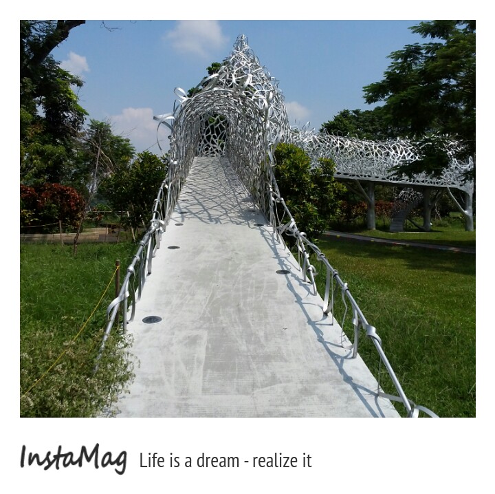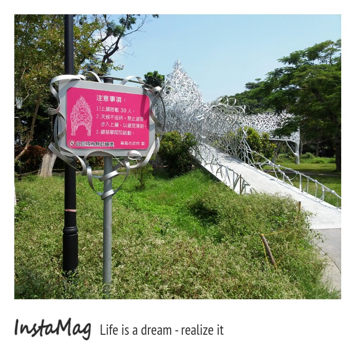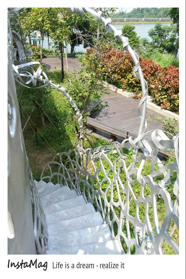 月影潭心位於嘉義市後花園的蘭潭風景區,有兩個入口可以走上去,一邊是樓梯,另一邊是做成無障礙的斜坡,白天就像個靜態的藝術品,鳥巢式的設計和旁邊的樹木草地悄悄的結合成最美麗的一幅畫