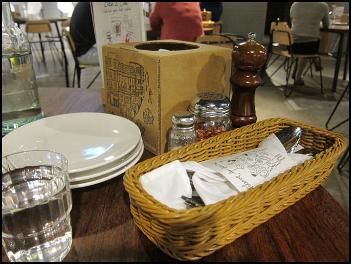 桌上已擺好餐具跟調味料,紙箱裡頭裝的是衛生紙,