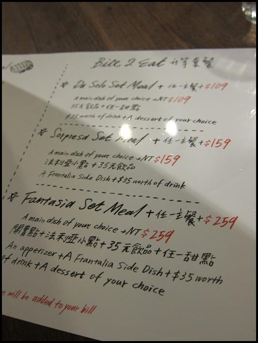 249元套餐有開胃菜、法利亞小點與35元飲品、99元甜點