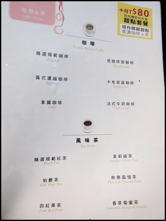 飲料只有咖啡跟熱茶兩種選擇,小姐說他們家的茶都是茶包,
