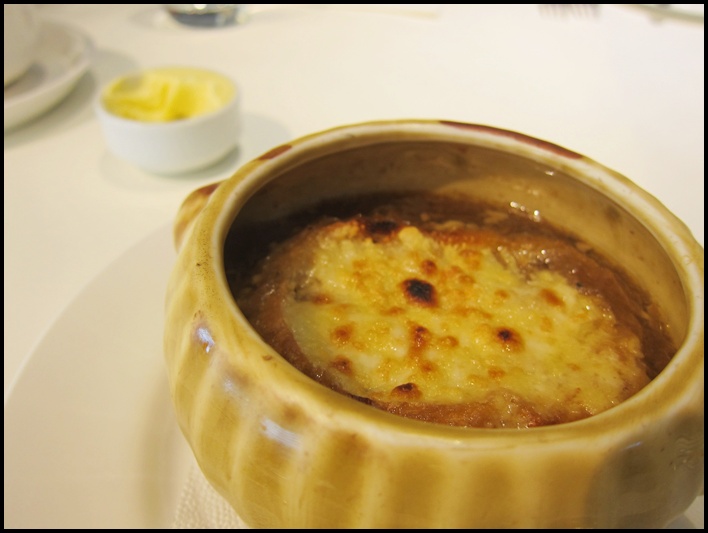 焗洋蔥湯上頭這塊麵包經過焗烤也不會吃起來乾乾硬硬的,