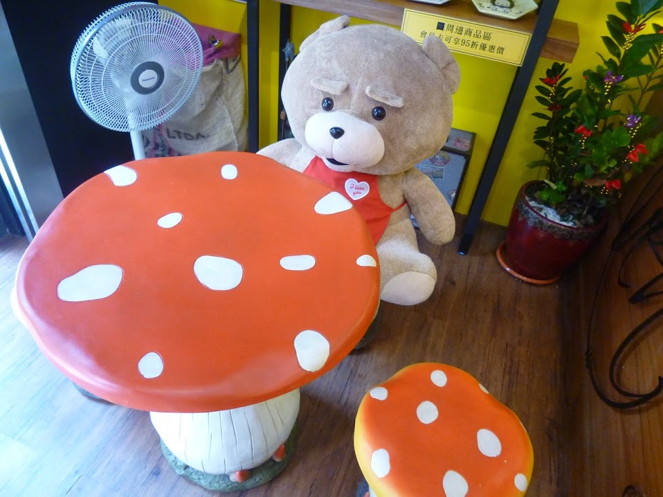 一看就是紅牌的麻吉熊還有特別的蘑菇桌椅給它坐XD
