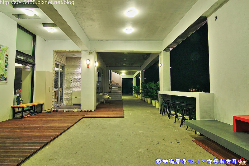 民宿走廊牆面維持乾淨,在夜晚拍攝更可突顯出這走廊的明亮