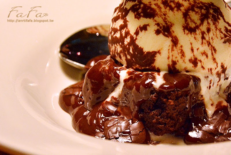 | 黑白配色系簡單得卻很吸睛,自製的溫熱巧克力核桃布朗尼,先淋上同樣也是自製的濃郁巧克力醬, 再放上冰涼的香草冰淇淋球,頂端放著特製鮮奶油球及巧克力脆片,以層層疊方式呈現。 跟MENU上的照片如出一轍,而實品更動人。 |