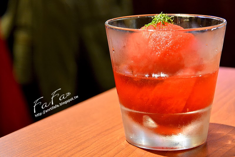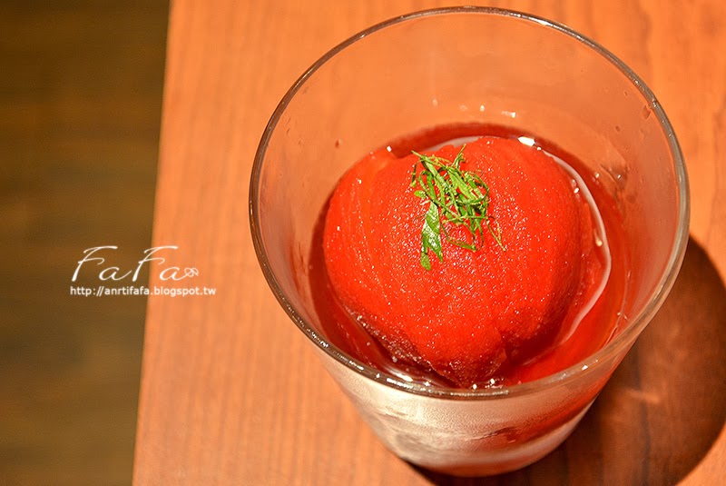 | 紅酒番茄NT$80 牛番茄是以紅酒、清酒、紫蘇、糖、鹽浸漬, 使用玻璃杯裝盛,將紅酒番茄反射得更閃閃發亮, 雖然嘗起來酸甜清爽,只是那後勁似乎是濃厚紫蘇氣味,像是奇怪香氛味道,個人不喜歡它與番茄的搭配。 |