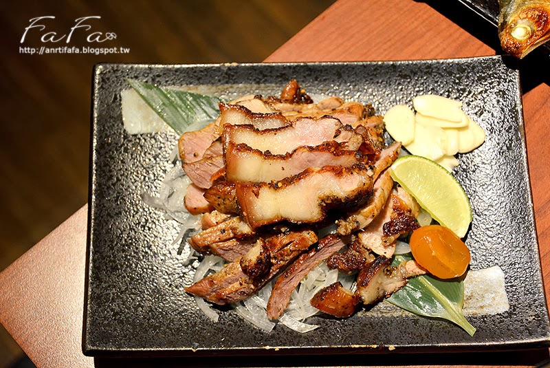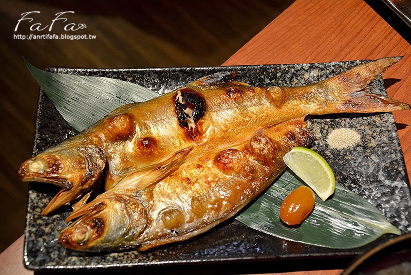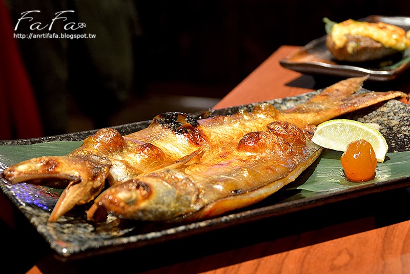 | 自家製午魚一夜干NT$280 魚皮烤的色澤亮麗還冒泡,有著酥脆輕盈感,不過不好撕開, 魚肉鹹味細緻適合下飯。 |