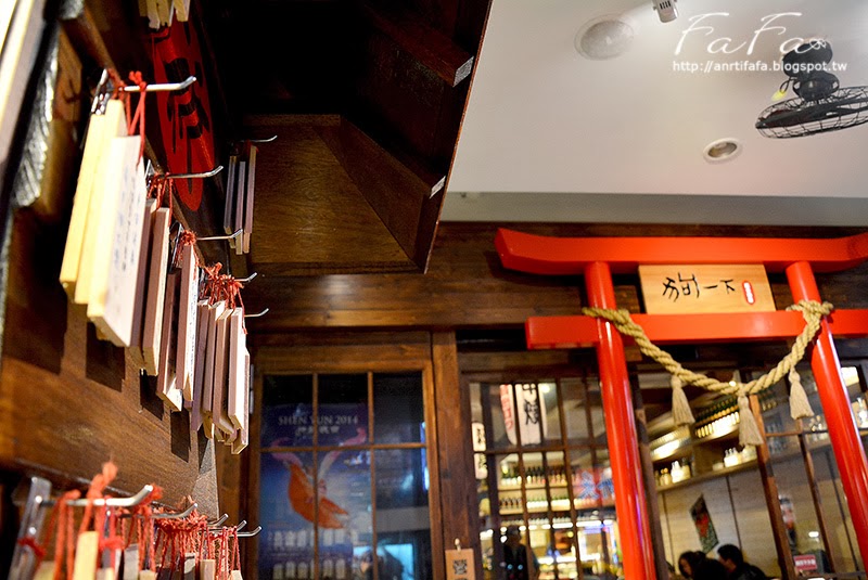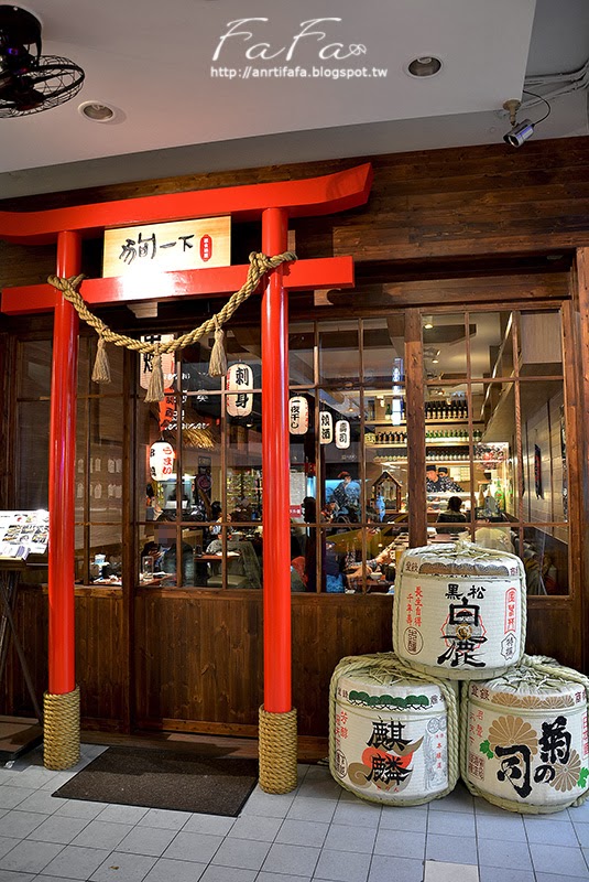 | 店門口除了特別纖瘦的鳥居造型, 一旁放置了三桶稻草包蓆木桶清酒"菰樽", 以及日式木拉門造型(是自動門)讓店面更顯日本味。 |