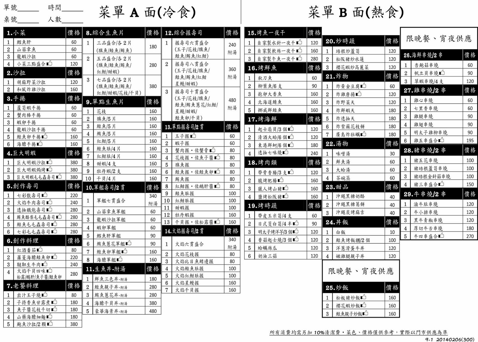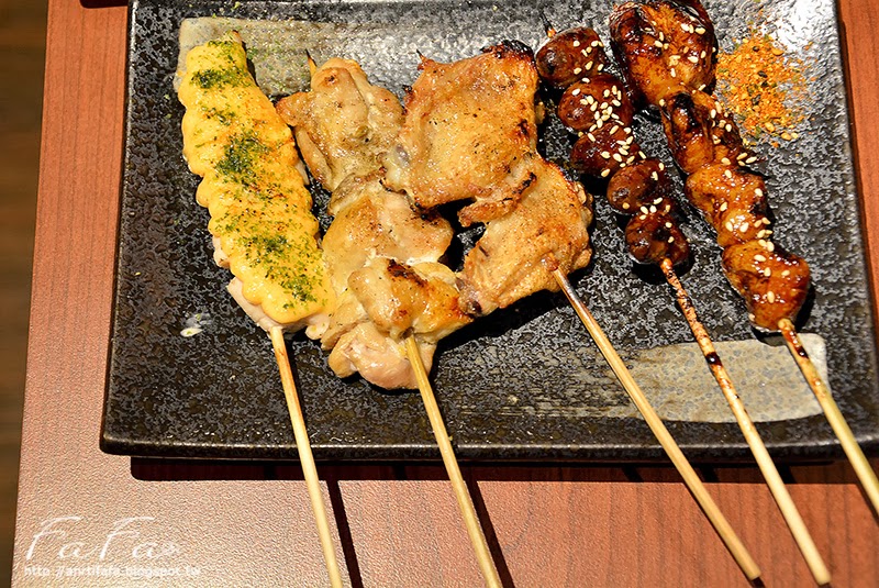 | 雞五串盛合NT$195 (以左至右)明太子雞柳、雞腿串燒、雞翅、雞心、七里香 明太子與雞柳搭配的挺潤口;雞腿串燒稍微以鹽巴胡椒佐味,有著適當的調味及多汁軟嫩的肉質, 雞翅外層焦脆;雞心也經處理過,變的小巧橢圓,照燒醬鹹香甜味讓雞心越嚼越有味。 |