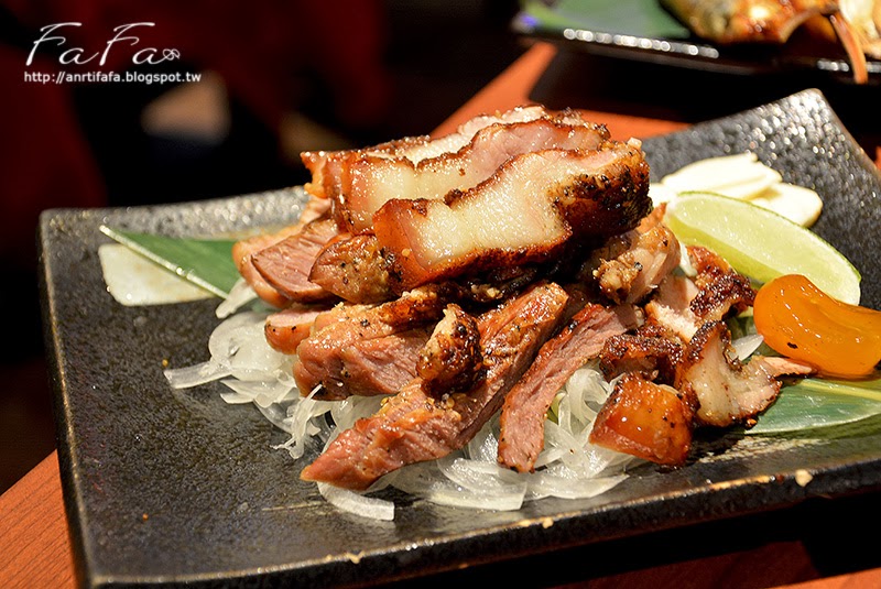 | 獵人烤山豬NT$160 屬於原住民料理的烤山豬,以這樣層層疊的方式擺盤, 頗有在石板上烹調的海派意象;山豬肉外皮焦脆,內肉精實有嚼勁, 不過鹽巴調味下手較重,整體味道都偏鹹,尤其是露在外層及上層部分,讓人有些不適。 |