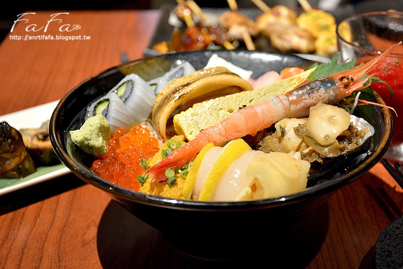| 生魚豪華海景丼NT$480 (附湯) 內容物有生魚片四種 : 鮭魚、鮪魚、旗魚、紅甘 星鰻、鮭魚卵、鮮蝦、海膽、黃瓜花枝卷、玉子燒、鮑魚、干貝, 搭配生薑、醃蘿蔔、紫蘇葉 整碗配料豐富,附上的味噌湯同樣材料豐富,豆腐、海帶還有鴻喜菇呢,味噌湯頭味道香濃不清淡。 |