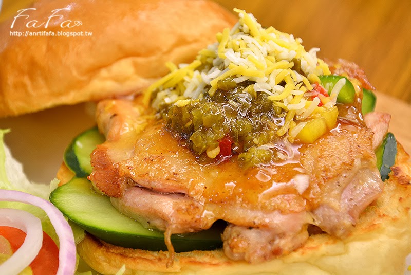 | 使用的是保有雞皮的去骨雞腿肉,如果不看旁邊的漢堡包,就是一道泰式佳餚呢, 店家特調的椒麻醬有一點點辣味與酸甜香味,與軟嫩多汁的雞腿肉搭配起來適合且好吃。 漢堡包感覺有先抹上奶油才烤過,有著淡淡香味,不過朋友不太喜歡這款麵包, 倒是他發現了店家使用的是大黃瓜片(胡瓜),讓我們嘖嘖稱奇。 |