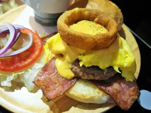 | 漢堡樓中樓NT$320 Next Door強調使用的是手打牛肉漢堡肉,且這款樓中樓有兩層, 兩層的手打肉,兩種的起司,分別為切達與瑞士起司, 交叉擺放的培根片體積長而寬,看起來超有氣勢。 |