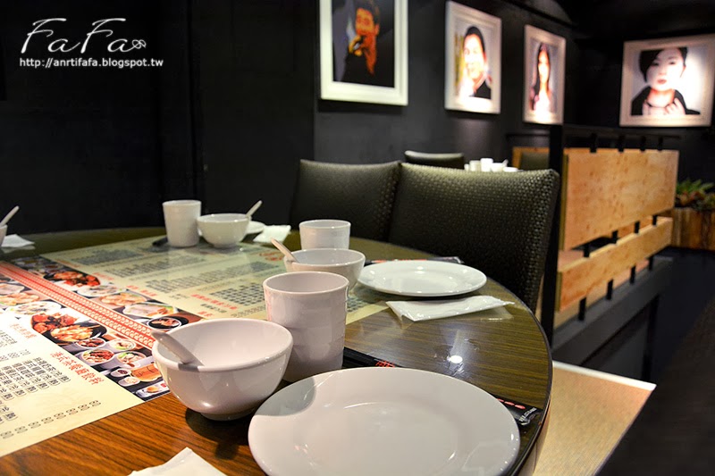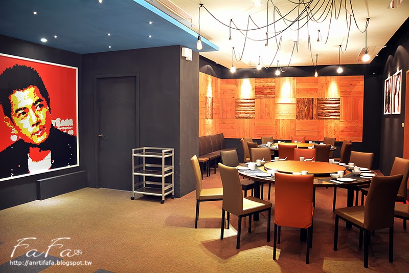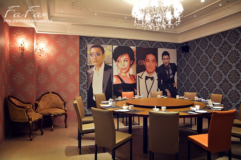 | B1樓層其中一處是VIP包廂,裡頭的壁紙燈飾較華麗,一旁還有復古華貴造型的沙發椅, 經理說約莫可容納十六位的小型宴會廳,同樣也掛著許多港星照片,也許因為肖像權問題,照片都有處理過。 |
