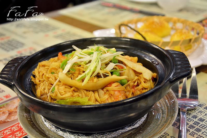 | 砂鍋海鮮伊麵NT$200 這種廣式伊麵長的有點類似台南的意麵,都是寬扁造型, 配料挺豐富的,有蝦球、青豆仁、墨魚片、草菇丁、魚片,主要以蠔油、醬油等調味料料理, 呈現油亮滑潤的褐色,上方則放著韭黃。 使用的鐵鍋溫度高,店員貼心的提醒要小心燙以及食用時要先攪拌過。 |