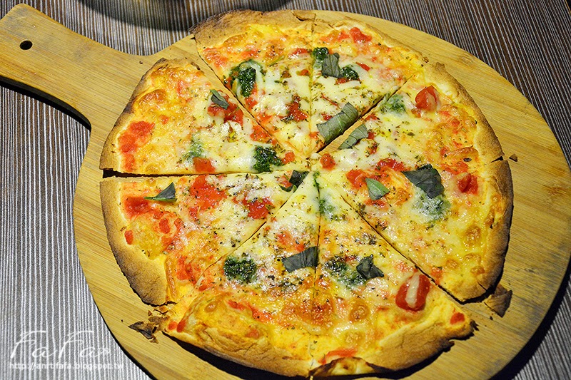 | 瑪格麗特披薩NT$180 想吃清爽的披薩,最好就是點一份瑪格麗特, 蘿勒的特殊薰香與番茄鮮味都很不錯,餅皮真的很輕薄,有香有脆,不過帶有一些焦苦味, 稍微有些干擾了主體的味道。 |