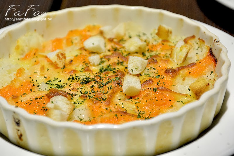| 焗烤明太子起司馬鈴薯 (限量)NT$100 送來時與我想像中不一樣,本來以為是將馬鈴薯泥回填在皮裡頭, 店家是使用烤盤裝盛,馬鈴薯保有顆粒小塊狀不是以泥狀呈現,也因此比較有咀嚼感, 明太子鹹香味十足很好吃,可惜馬鈴薯質地不夠細緻,很難與細小的明太子融合一起。 |