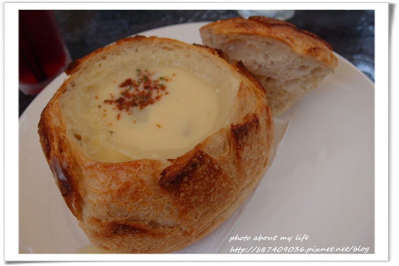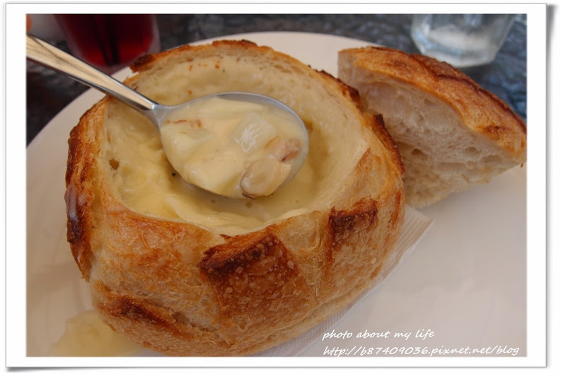 加點的舊金山麵包碗(30元)就是把酸麵包當湯碗 連湯帶碗吃很有飽足感 建議2人以上分食