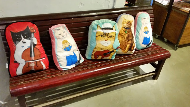 接著一路下來看到的長長的長椅上都擺設著可愛的以店貓為主題的可愛貓咪抱枕。