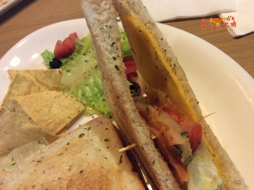 剛好可以夾上玉米片與生菜一起食用,這樣就把洞填滿了~口感既滿足又多層次,不過我覺得他的CP不如一份7-11三明治ˊ_>ˋ