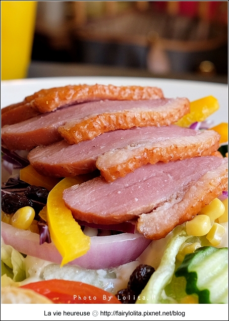 沙拉鮮豔的配色,再加上彷彿透著肉汁的鴨肉,這組合著實有叫人食慾大開的魔力,記得在宜蘭的合盛太平也有吃過,平常的鴨肉當然比不上櫻桃鴨,但其實起司大衛的這道輕食表現也相當不錯。