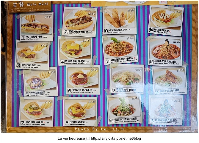 簡易菜單就只有兩頁,但提供的餐點卻比我想像中還要豐富,除了原有的長艇堡、薯條之外,還多了漢堡、沙拉、義大利麵及甜點,有種融合美義式的FU。