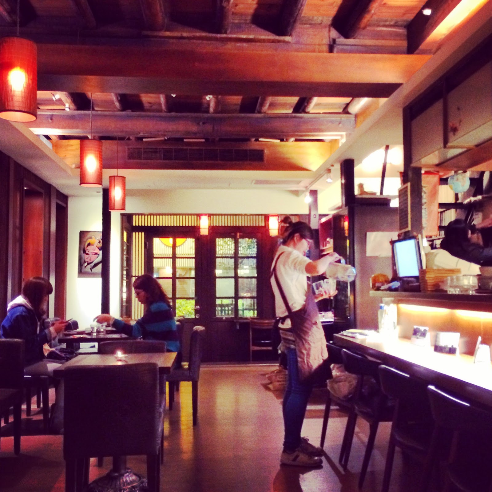暗色木調的裝潢、昏黃燈光加上服務生的褐色圍裙,