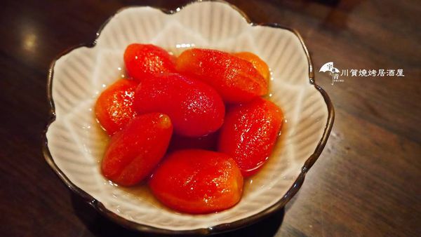 燙過褪皮的蕃茄把梅汁吸的飽滿,Q軟好食,很適合搭配烤物食用喔!