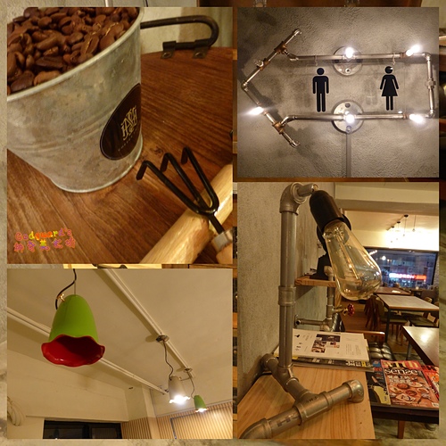 濃濃的工業風,密佈著整間餐廳,(左上)土鏟、(右下)水管燈、(左下)造型奇特的燈泡、(右上)極具創意的指示牌,一再讓人會心一笑^w^