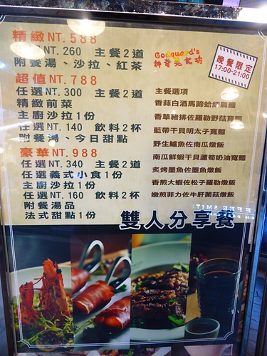 這是咱們點的雙人超值套餐$788,提供給大家參考看看:$300以內主餐*1+前菜*2+主廚沙拉*1+濃湯*1+飲料$140*2+甜點*2