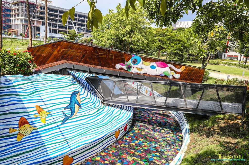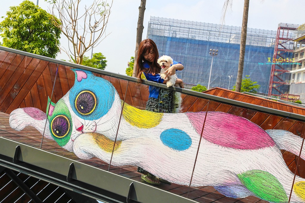一旁也有木矮橋,玻璃上有一隻彩色貓咪,下方也有許多水中生物彩繪以及愛心,